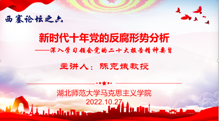 10月27日下午,好色tv 成功举办第六次“西塞论坛”。为将学术研究和学习宣传党的二十大精神有机结合,学院特邀长期从事党史党建研究的陈克娥教授在学院会议室做题为“新时代十年党的反腐形势分析”讲座,以此带领学院师生一起深入学习领会党的二十大报告精神要旨。讲座由学院副院长汪灿德主持,新增硕士生导师和全体研究生聆听了此次讲座。