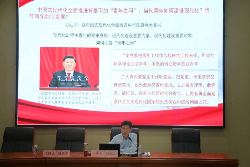 赵凌云教授以现代化进程中青年的双重身份入题,向在座师生发出“当代青年如何建设现代化?”“当年青年如何发展?”的“青年之问”。随后,他结合党的二十大报告中关于青年的重要论述和自己的学习体会指出,回答“青年之问”的关键在于用党的创新理论武装自己,并从“学”“思”“践”“悟”四个层面展开系统论述。赵教授认为,“学”就是要系统掌握习近平新时代中国特色社会主义思想的知识体系,“思”就是要深刻领会习近平新时代中国特色社会主义思想的形成逻辑,“践”就是要切实践行习近平新时代中国特色社会主义思想的世界观方法论,“悟”就是要牢固确立对党的科学理论重大意义和自身使命的精神体认。当代青年要充分认识习近平新时代中国特色社会主义思想的重大意义,在中国式现代化进程中清醒认识和努力担当青年使命,把自身发展融入现代化建设,立志做有理想、敢担当、能吃苦、肯奋斗的新时代好青年。