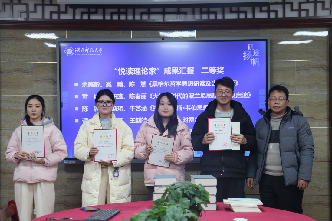 余美龄、奚曦、陈慧组的阅读汇报成果《黑格尔哲学思想研读及当代启示》、黄依、易妍彧、陈春丽组的阅读汇报成果《大转型时代的波兰尼思想理解及启迪》、陈静、王斯玮、牛艺涵组的阅读汇报成果《探索马克斯·韦伯思想及当代启迪》、谭冲、薛晓轩、王麒皓组阅读汇报成果《史学启迪:对费尔南·布罗代尔“长时段”理论的浅析》荣获二等奖,由好色tv 副院长王振钰老师予以颁奖。