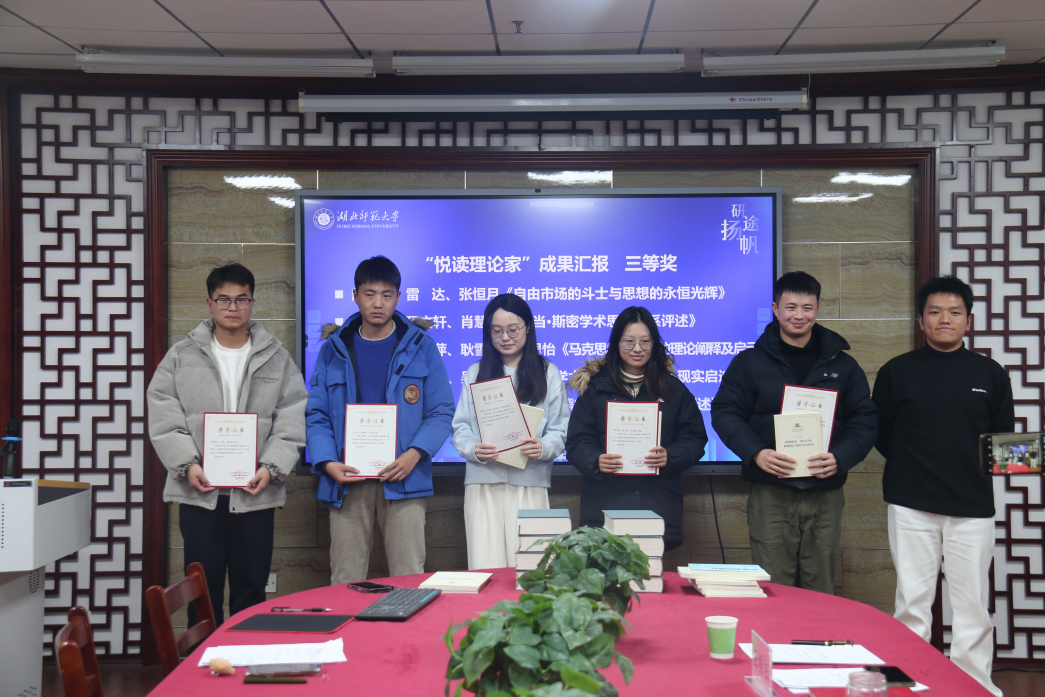 赵召健、雷达、张恒月组的阅读汇报成果《亚当·斯密学术思想谱系评述》、缪瑞丰、程文轩、肖慧敏组的阅读汇报成果《亚当·斯密学术思想谱系评述》、张菡铄、朱亚萍、耿雪盈、韩思怡组的阅读汇报成果《马克思学术思想的理论阐释及启示》、李炎泽、张瀚文、吴迪组的阅读汇报成果《恩格斯学术思想谱系评述及现实启迪》、张绪文、杜震、赵满熠组的阅读汇报成果《约瑟夫·熊彼特学术思想谱系评述》荣获三等奖,由好色tv 24研班长吴迪予以颁奖。