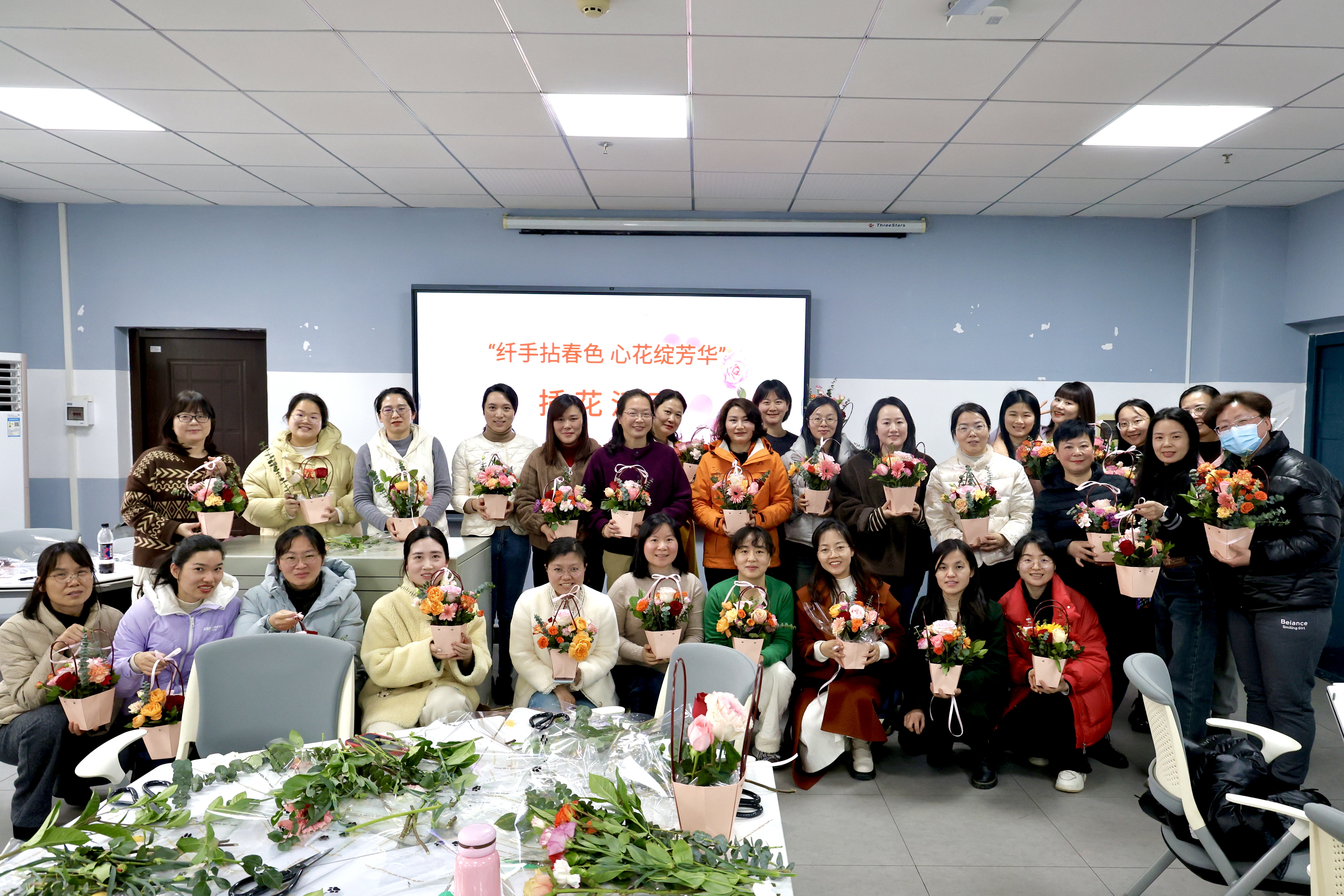 活动结束后,一篮篮承载着巧思的花艺作品被带往各办公室,为校园增添了一抹动人的春色。此次活动不仅提升了教职工的艺术修养,更通过指尖艺术传递出新时代女性自信优雅的精神风貌。(撰稿:张磊)