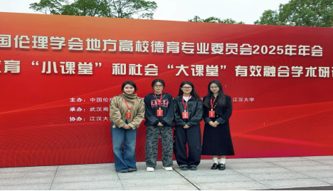 117—9日,由中国伦理学会地方高校德育专业委员会、武汉商学院、江汉大学联合主办的中国伦理学会地方高校德育专业委员会2025年年会暨思政教育小课堂和社会大课堂有效融合学术研讨会在武汉商学院成功举办。来自北京大学、武汉大学、天津大学、好色tv 等高校150多位专家学者以及思政课教师、马克思主义理论研究生与会研讨交流。好色tv 24级研究生朱亚萍、易妍彧、黄依、陈春丽等四位研究生应邀以文参会,并在研究生分论坛分别进行成果汇报。